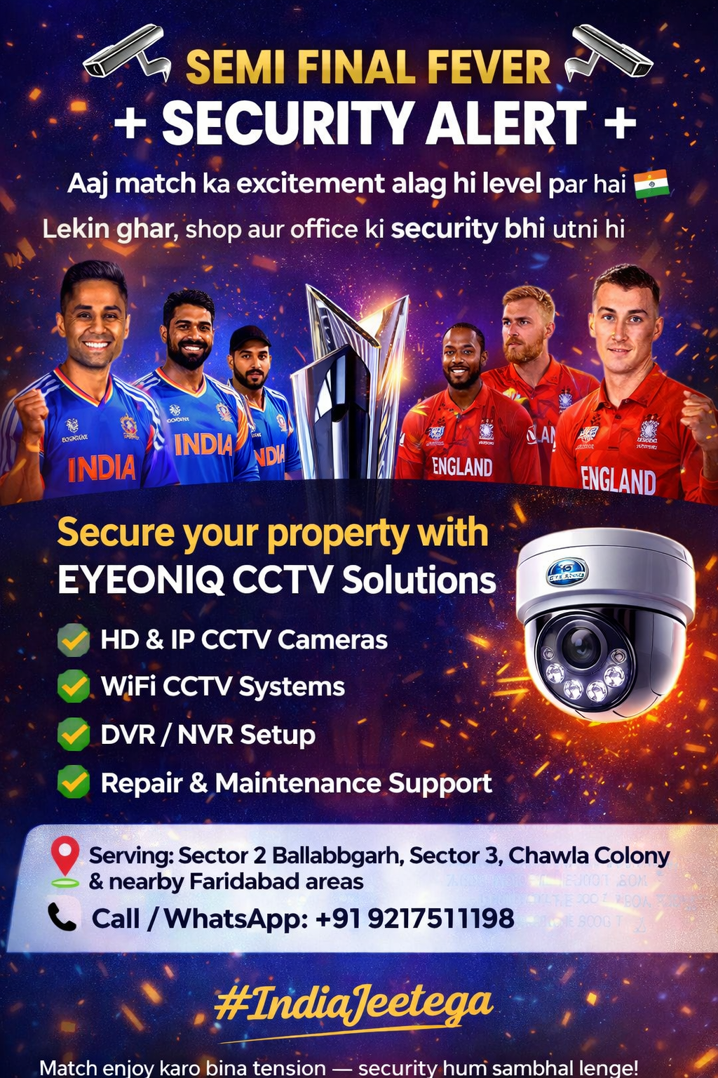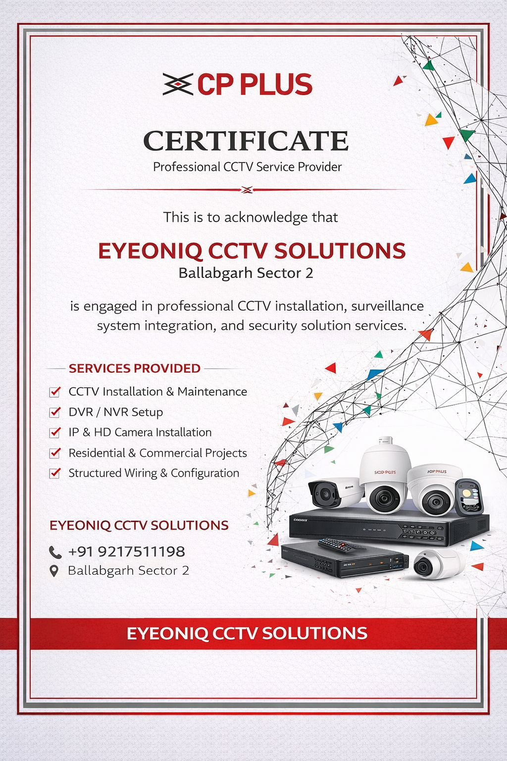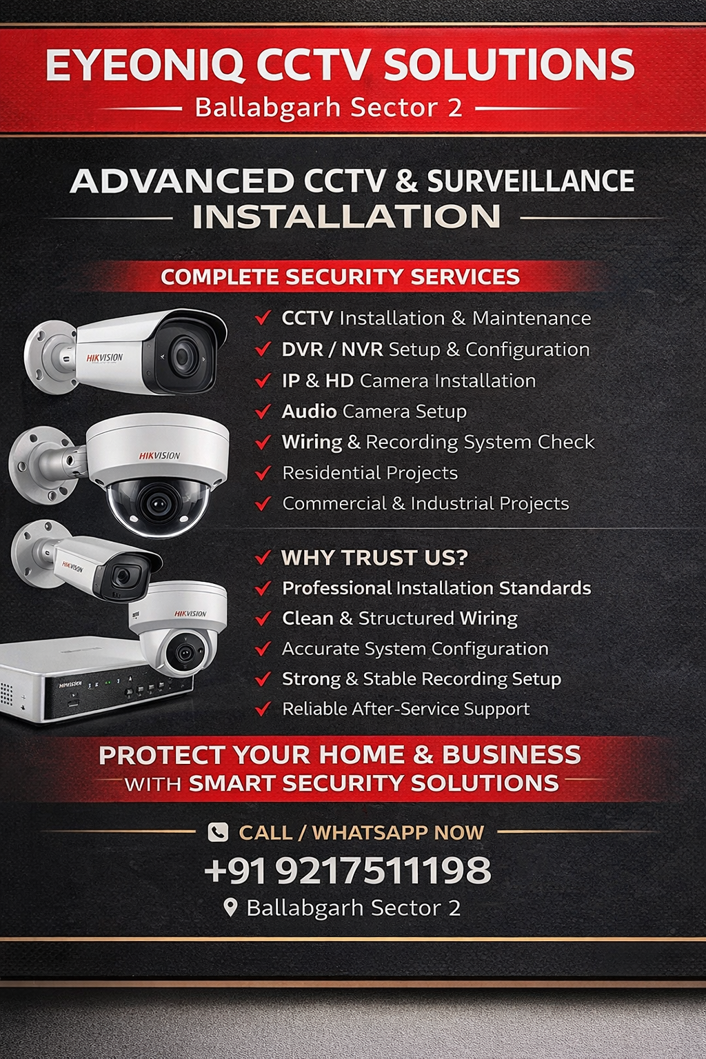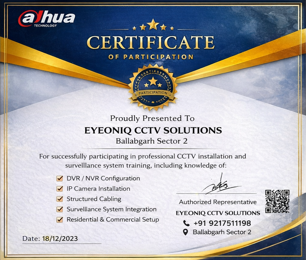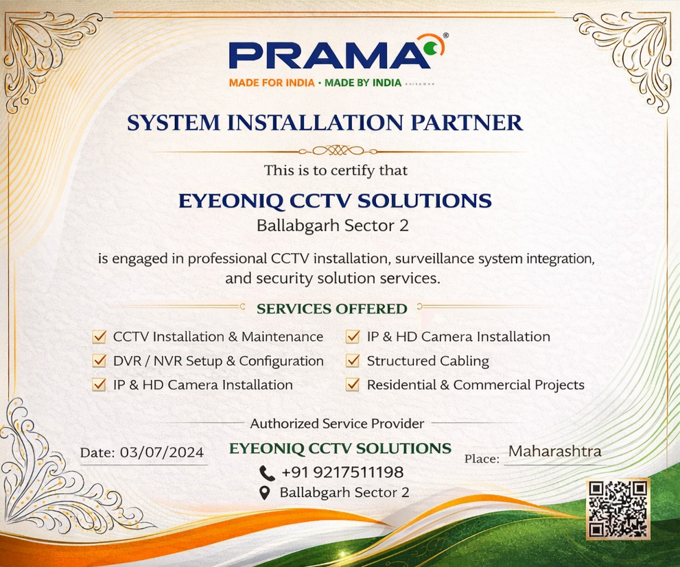 EYEONIQ CCTV Solutions, Ballabgarh, Faridabad's trusted CCTV specialists, expertly install, repair, and maintain top-notch security systems. As a premier camera shop and repair center, we supply high-quality cameras and provide reliable CCTV camera fixing near me services. Our skilled technicians deliver prompt and professional CCTV camera installation service, ensuring seamless integration with your existing setup. Trust us for all your CCTV repairs and maintenance needs. Get in touch with us today to experience unparalleled security solutions!