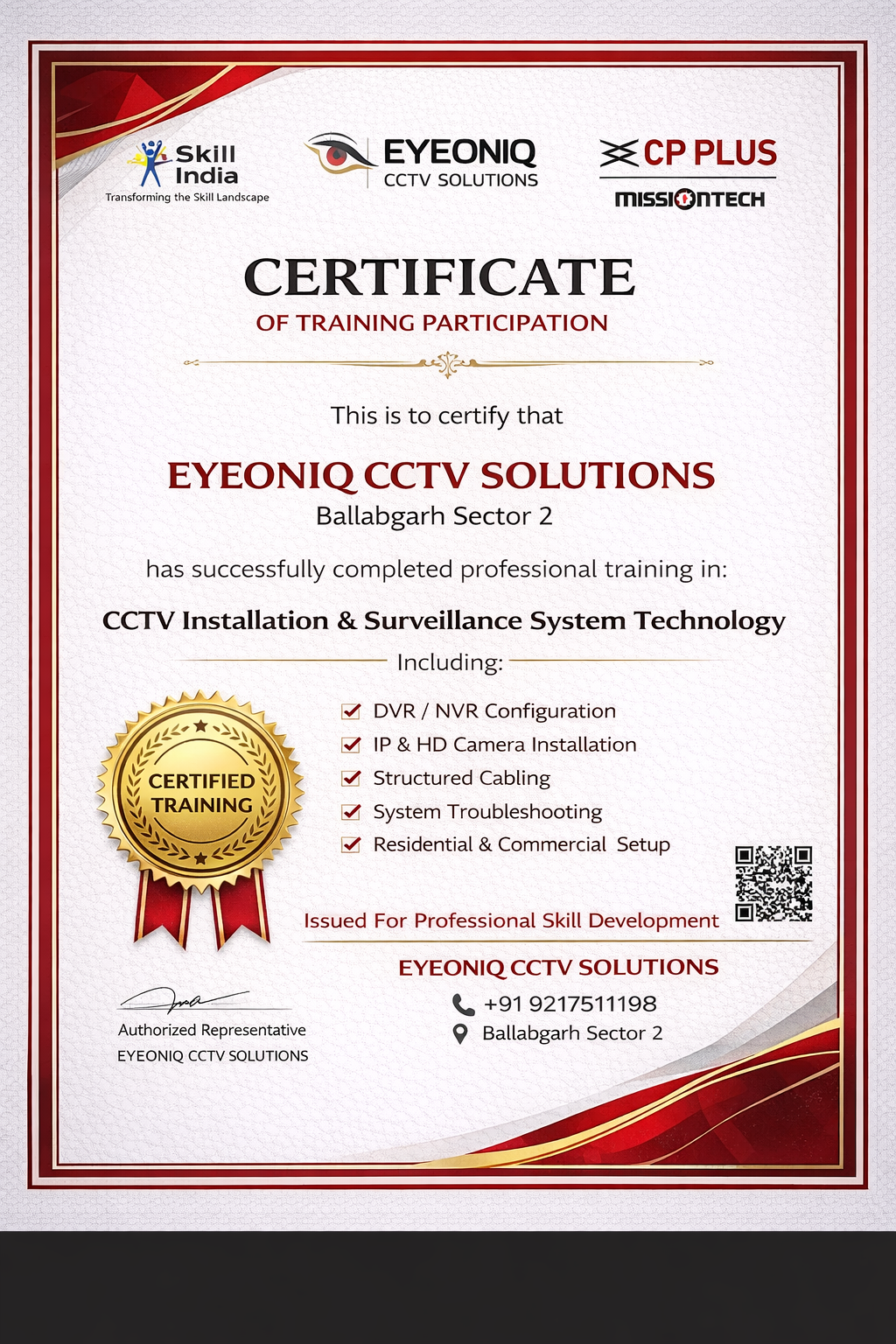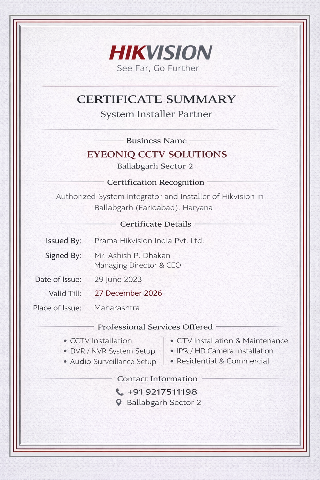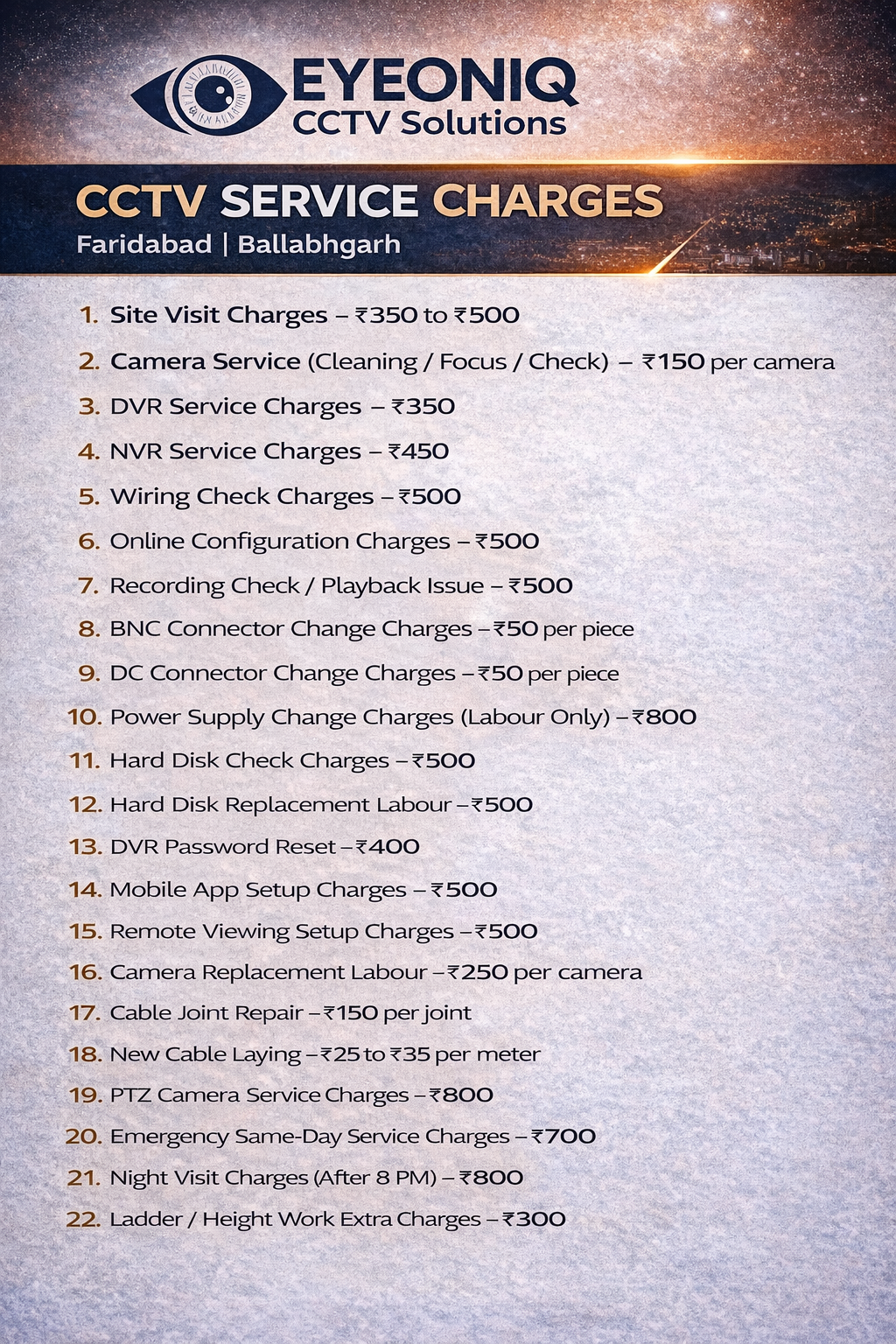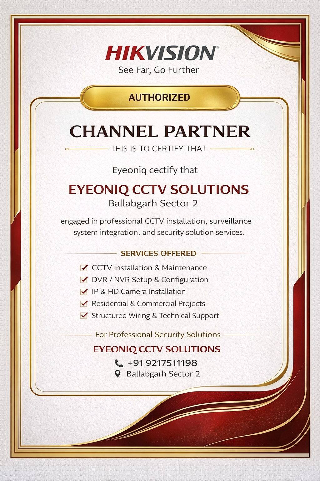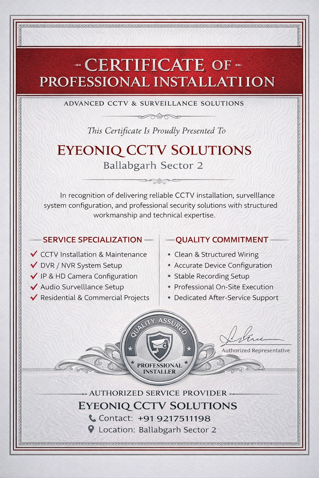 EYEONIQ CCTV Solutions, Ballabgarh, Faridabad's trusted CCTV specialists, expertly install, repair, and maintain top-notch security systems. As a premier camera shop and repair center, we supply high-quality cameras and provide reliable CCTV camera fixing near me services. Our skilled technicians deliver prompt and professional CCTV camera installation service, ensuring seamless integration with your existing setup. Trust us for all your CCTV repairs and maintenance needs. Get in touch with us today to experience unparalleled security solutions!